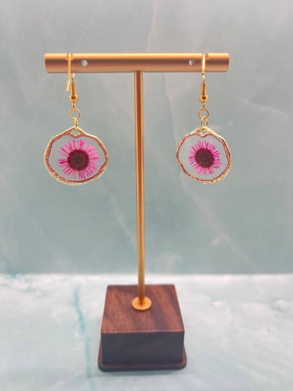 Elise est une paire de boucles d'oreilles réalisée à la main et composée de résine et de fleurs séchées.